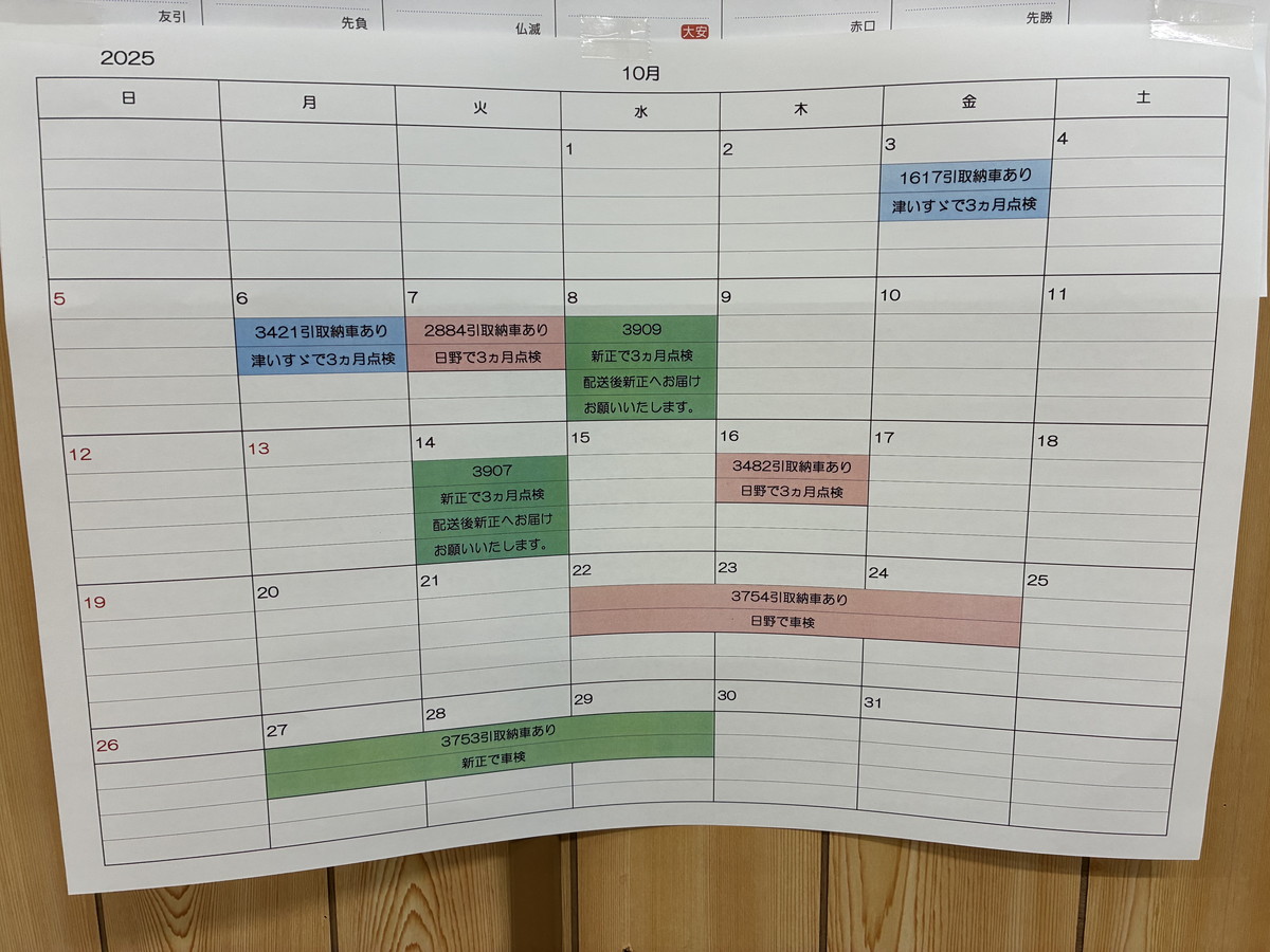このたび、車両の車検日・3ヶ月点検日・修理予定日を一覧で確認できる「車両管理カレンダー」を作成いたしました。乗務員の皆様にもご確認いただけるように共有しており、業務の合間でもスムーズに予定の把握が可能です。また、内容ごとに色分けすることで、視認性を高め、ひと目で必要な情報が分かるよう工夫しております。今後も、より安全かつ効率的な運行管理に努めてまいります。